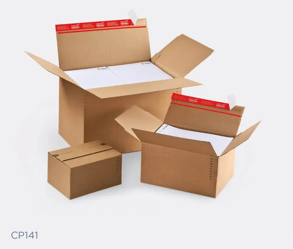 ColomPac CP141 and 151 style boxes have the same fast assembly box base but have a traditional size top with the addition of self-adhesive seal and tear open strips.